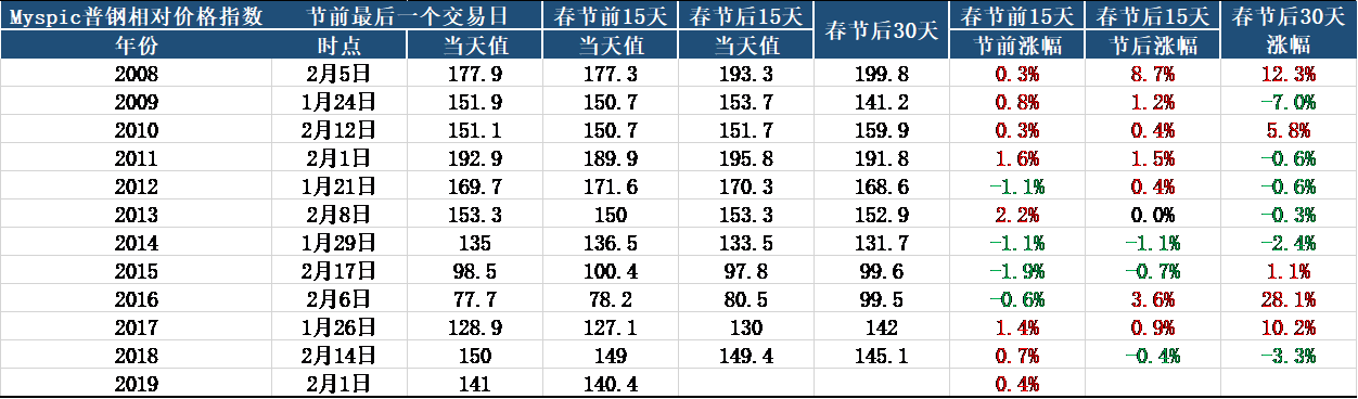具體價格方面,從往年Myspic普鋼先對價格指數(shù)的春節(jié)前后對比來看,最近十年有70%的概率節(jié)日前后15日價格漲跌趨勢一致。2019年春節(jié)前15日鋼價指數(shù)累計小幅上漲0.4%,預(yù)計開門紅行情大概率出現(xiàn)。