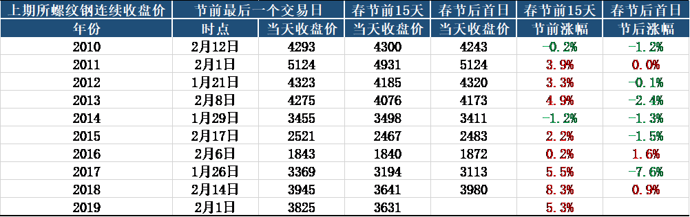 再看期貨,從螺紋鋼上市十年春節(jié)前后價格對比來看,節(jié)前15日呈上漲趨勢的概率較大,但是節(jié)后價格跌破節(jié)前最后一日收盤價是大概率事件,今年需警惕類似價格走勢的出現(xiàn)。